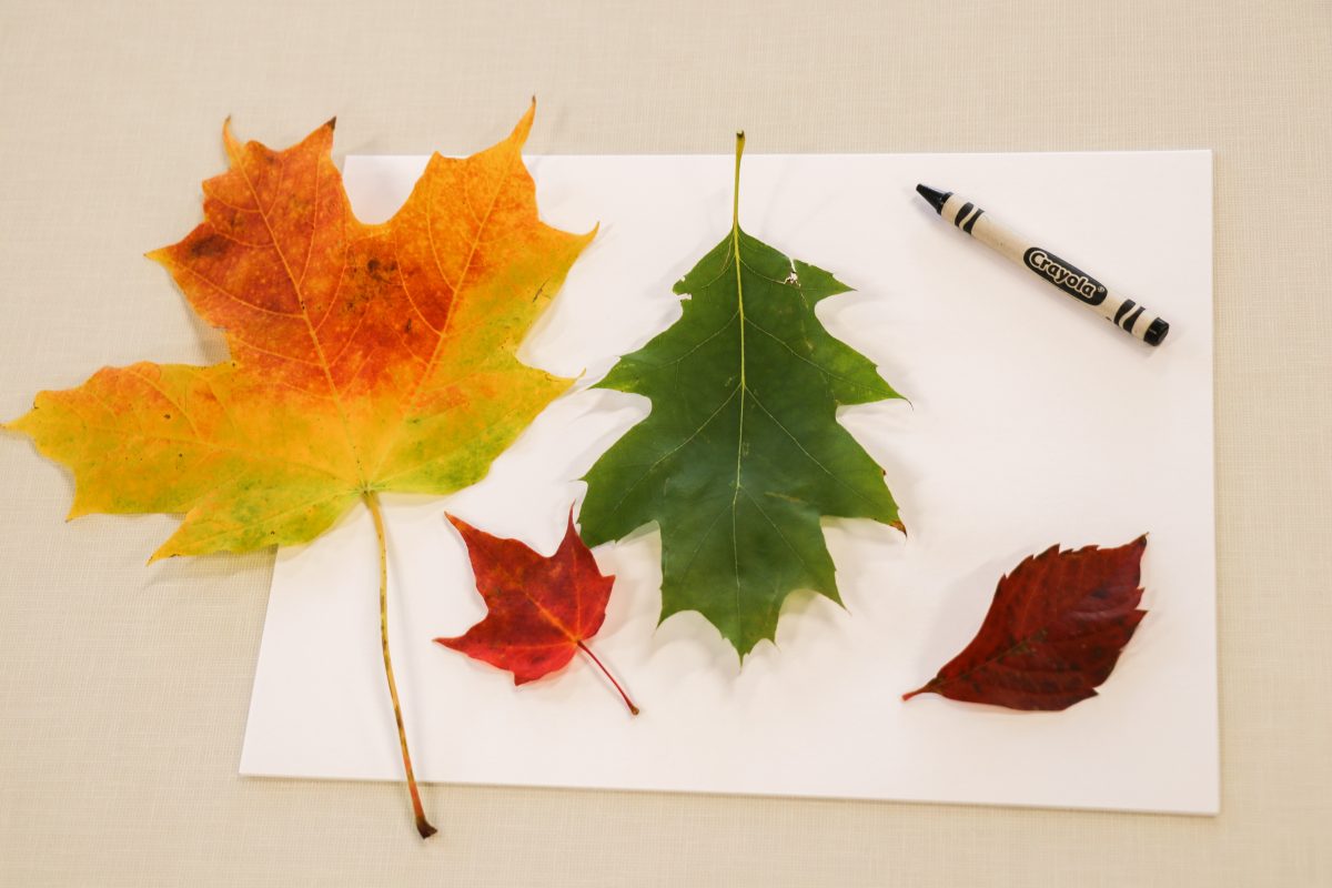 Start by making many leaf rubbings with leaves of all different shapes and sizes. To make the leaf rubbing easier for little ones, try taping the leaf to another piece of paper or poster board before placing the other paper on top. This will help the leaf stay in place.